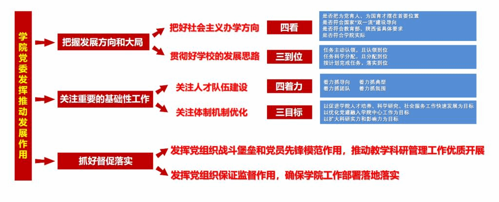 把握发展方向和大局。发挥政治核心作用把方向,党政一体,共同推动学院事业健康发展。一是把好社会主义办学方向。制定政策、推动工作时,看是否把为党育人、为国育才摆在首要位置,有利于贯彻落实立德树人这个根本任务;是否符合国家“双一流”建设导向,对学院跨越式发展有利;是否符合教育部、陕西省具体要求;是否切合学院实际。二是贯彻好学校的发展思路。确定学院目标、任务和发展规划时,重点关注学校党代会、发展规划、年度计划,是否做到任务主动认领、且认领到位,任务是否科学分配、且分配到位,是否按计划完成任务、落实到位。