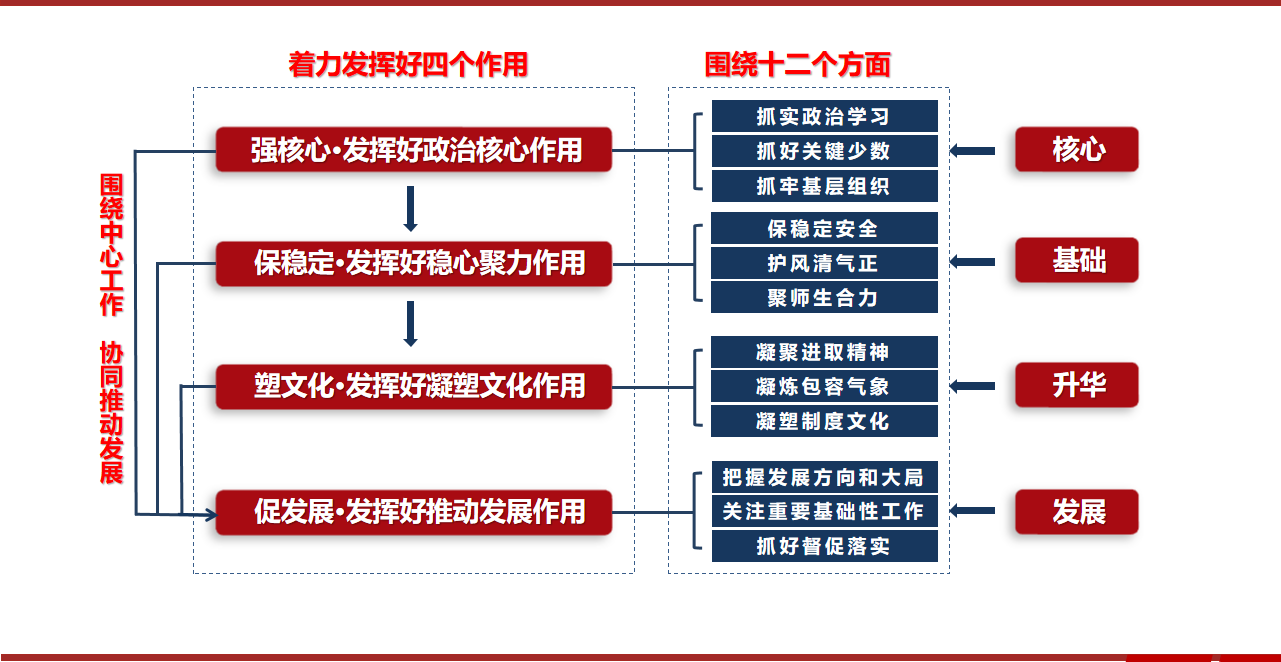 BOB·体育综合APP下载办学历史长、专业老、学院新,人才辈出、发展曲折。目前,师生体量偏小、学科底子薄弱、科研条件不足。面对这一客观现实和前甩后追的发展形势,BOB·体育综合APP下载党委聚焦主责主业,坚持“跳出党建看党建、围绕发展抓党建”的工作理念,以政治核心、稳心聚力、凝塑文化、推动发展等“四个作用发挥”作为党委工作出发点和落脚点,强核心、保稳定、塑文化、促发展,构建了十二个方面,包含三十三项具体任务的工作体系,团结带领全院师生开拓创新,埋头苦干,有力地推动了学院事业快速健康发展。