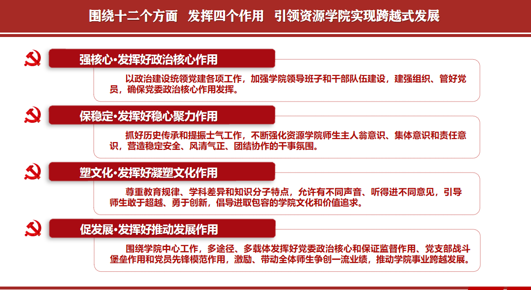 “跳出党建看党建、围绕发展抓党建”。党建工作深入扎实有效开展,为资源学院事业快速健康发展提供了坚强组织保障。