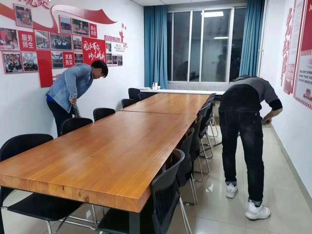 在活动开展过程中,同学们有序分配,通力合作,在雁塔校区工科楼6层指定清洁区域开展工作,对公共区域的桌椅、地面进行了全面、细致的清洁打扫、完成消杀。同学们都以饱满的热情与认真的态度对待本次活动,充分发扬“不怕苦、不怕累、不怕脏”的劳动精神,发挥研究生第一党支部战斗堡垒作用。