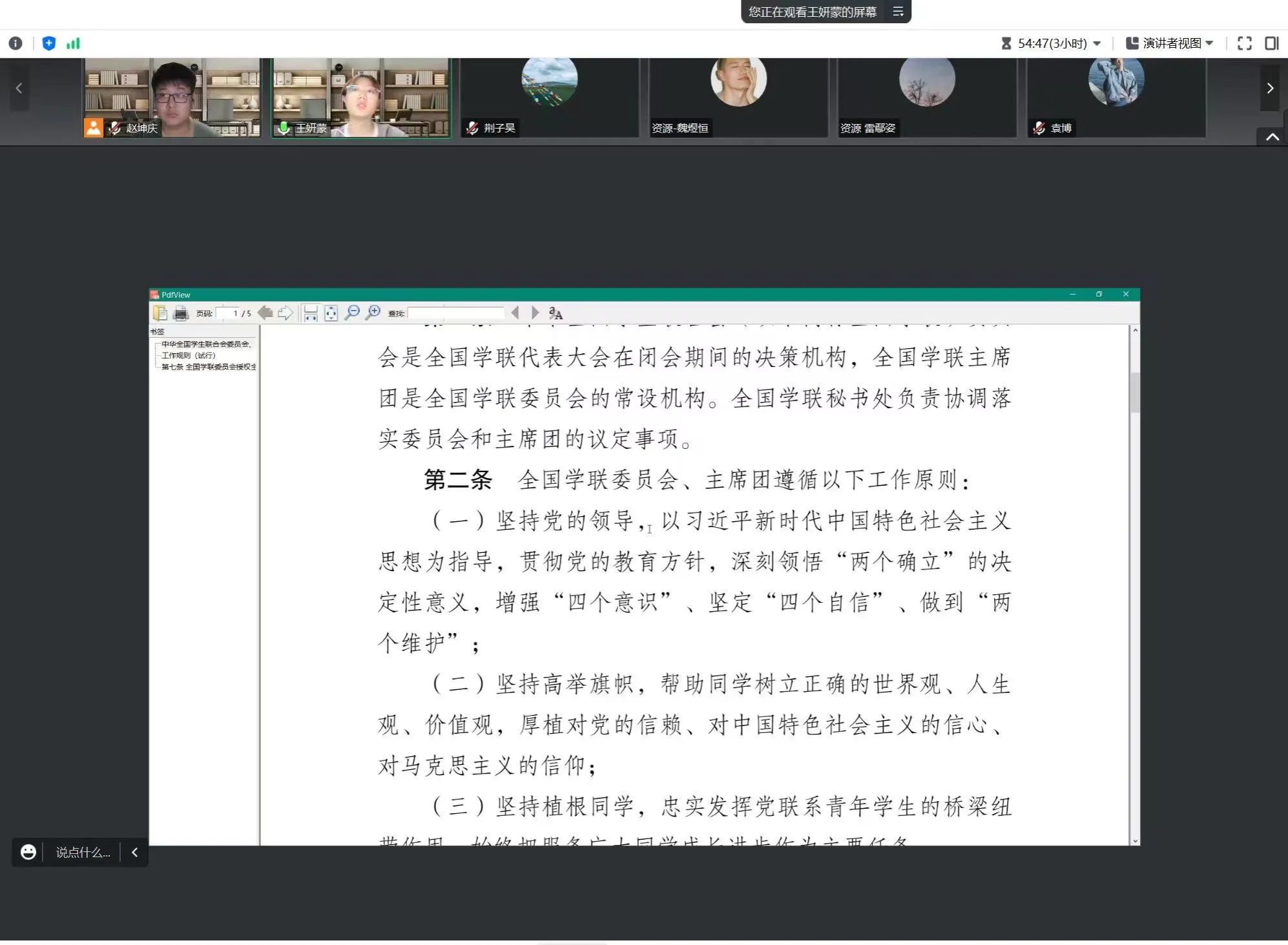 研究生会主席团成员王妍蒙同学宣传了《关于认真学习宣传贯彻党的二十大精神团结带领广大同学坚定跟党走、奋进新征程的决议》和《中华全国学生联合会委员会、主席团工作规则(试行)》的文件,带领全体参会人员深入学习二十大精神和全国校联委员会和主席团工作的规则。