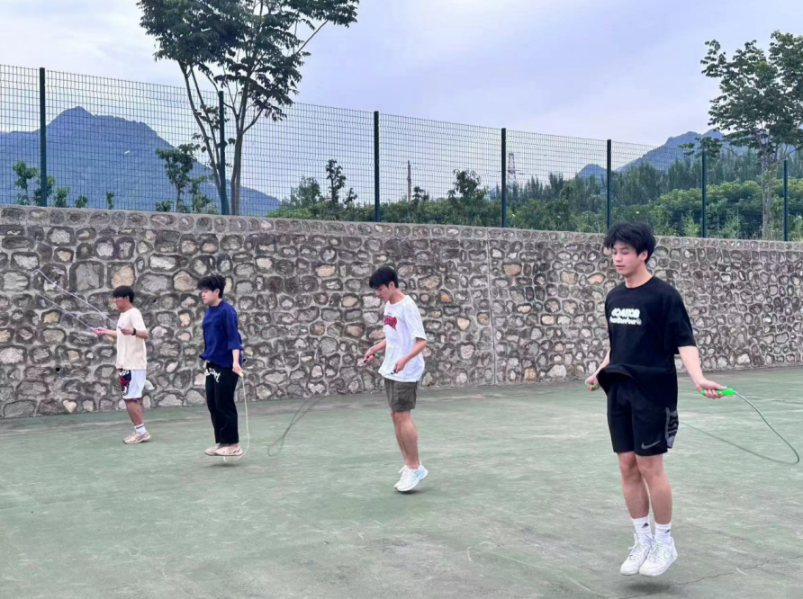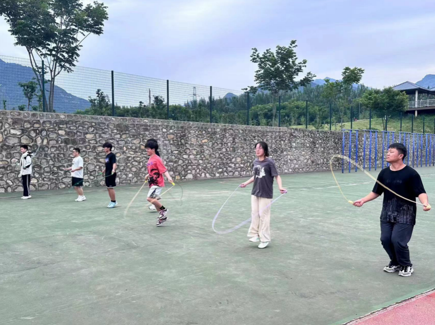五月末,夏暑升,炎热难耐,不敌坚韧,纵横交错的绳链,在空中挥动着,驱走了暑气与热风。一根短绳,被双手带动着,双腿离地,跨过一道道由细绳组成的坎,飞跃、脱离、触碰、重启,在极短时间里,看不清的绳,健康在运动中延伸,每一名同学都拼尽全力努力打破自己的极限,与绳共舞,神采飞扬。