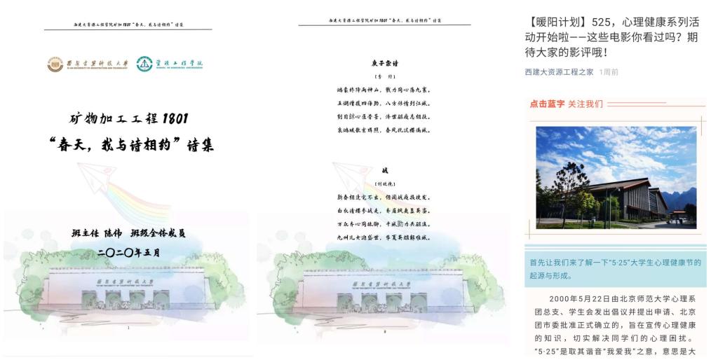 在做好日常心理健康教育工作的基础上,学院积极鼓励学生以文字、书画等表达内心,矿加1801班整理形成“春天·我与诗相约”诗集,收录25首作品,表达了疫情期间同学们的情绪状态。组织开展“525,心理影片赏析”活动,引导学生在观影中感受生活,在撰写影评中收获感悟。