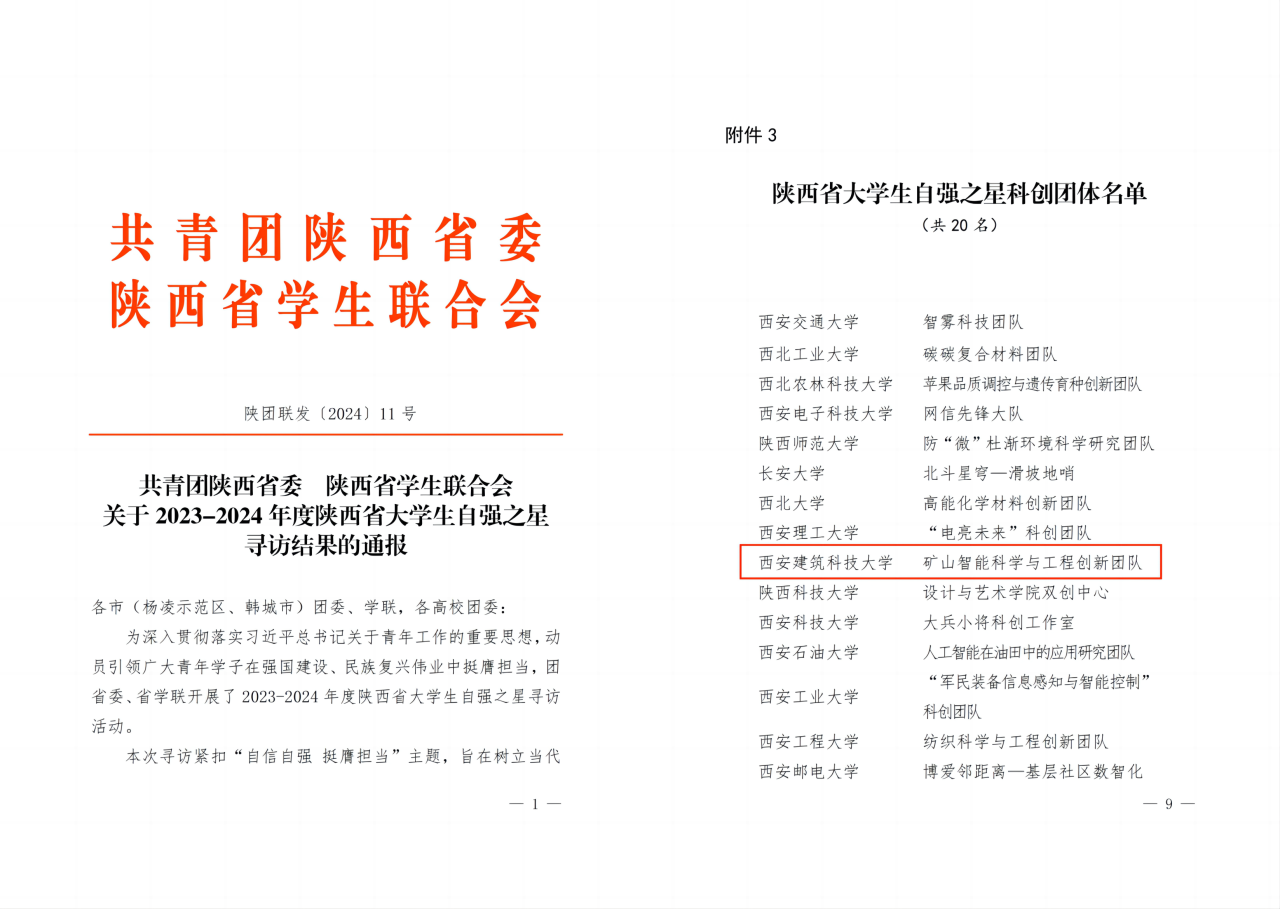 此外,共青团陕西省委、陕西省学生联合会印发《关于2023-2024年度陕西省大学生自强之星寻访结果的通报》,学院矿山智能科学与工程创新团队获2023-2024年度“陕西省大学生自强之星科创团体”称号。