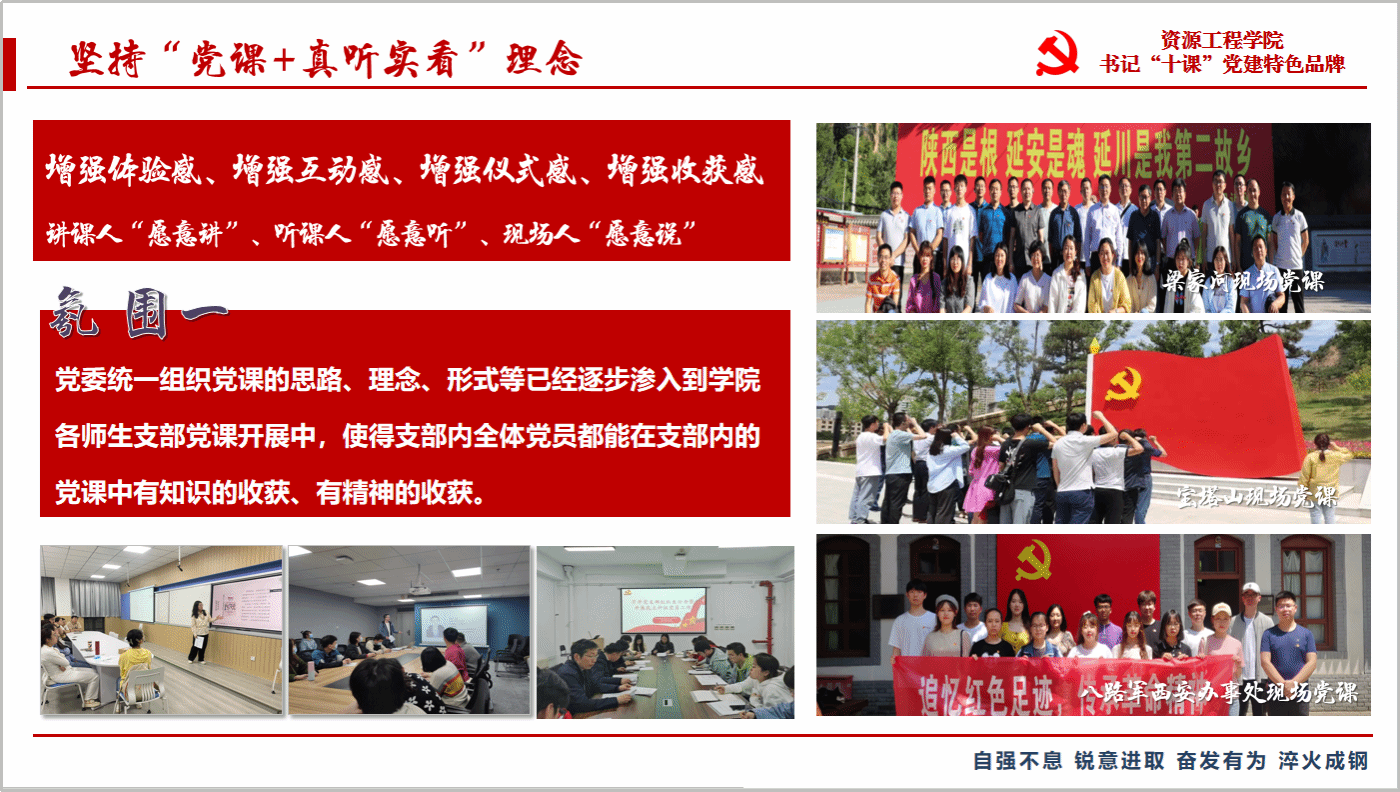 此项品牌活动建设的目的在于坚守党课阵地、创新讲授党课形式、构建党课内容体系,探索解决党课无感、无趣、无效的新方式、新思路。在活动开展过程中着力塑造党课“现场听、真实看、亲身悟”的活动理念。一是将“线下面对面”的方式一以贯之,弱化网络工具、新媒体平台在活动开展中的作用发挥,引导师生党员全身心融入现场讲述氛围中,不仅仅作为聆听者,更以交流者的身份参与,以此活动的精致打造补足线下党课教育作用发挥的缺陷。二是将“在故事发生地讲党的故事”的形式坚持落实,先后前往了宝塔山、梁家河、八路军驻西安办事处等地讲党课,让党员感受实地环境和氛围,详细了解党的历史,深度感悟先辈精神,从而思考现在,启迪未来。在持续建设过程中,学院党委通过增强体验感、增强互动感、增强仪式感、增强收获感,着力打造讲课人“愿意讲”、听课人“愿意听”、现场人“愿意说”的党课平台。一方面,学院领导班子、各师生党支部书记讲党课自主性增强,学生支部书记交叉讲党课的良好氛围已形成。另一方面,党委统一组织党课的思路、理念、形式等已经逐步渗入到学院各师生支部党课开展中,使得支部内全体党员都能在支部内的党课中有知识的收获、有精神的收获,党课活力基本激发,学习氛围感逐步向好。