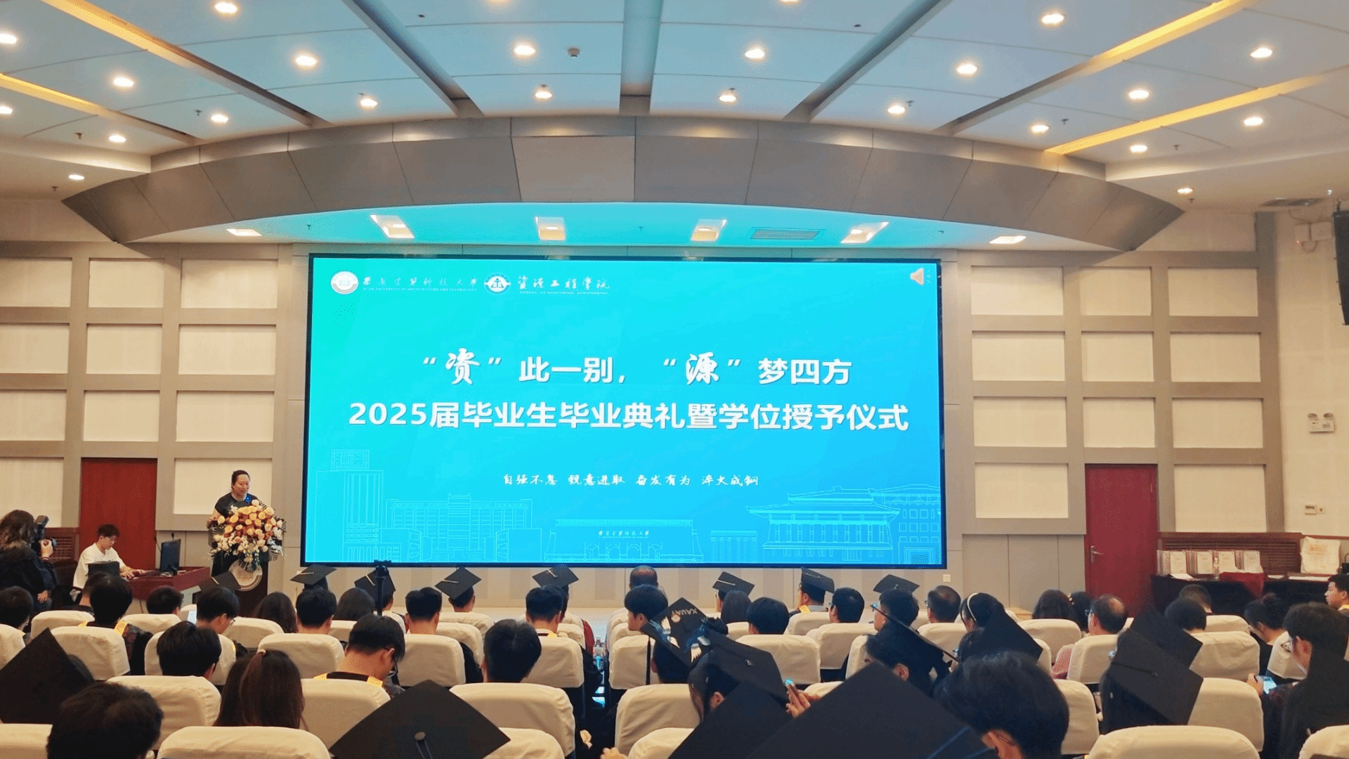 在婉转悠扬的旋律中,毕业生安一帆、张驰深情献唱《凤凰花开的路口》,用动人的歌声为毕业典礼拉开帷幕。院长顾清华在学院典礼上致辞。他热烈祝贺343名毕业生圆满完成学业,向辛勤培育学生的全体教师表达崇高敬意与诚挚感谢,并向即将奔赴祖国各地的毕业生提出三点期许:一是树立科技报国的志向,做“自强不息”的资源青年;二是秉持创新创造的精神,做“锐意进取”的资源青年;三是磨砺水滴石穿的毅力,做“奋发有为”的资源青年。最后,顾清华勉励全体毕业生立足岗位积极投身国家建设,在中华民族伟大复兴的壮阔征程中淬火成钢,用智慧和汗水谱写出属于新时代资源人的辉煌篇章。